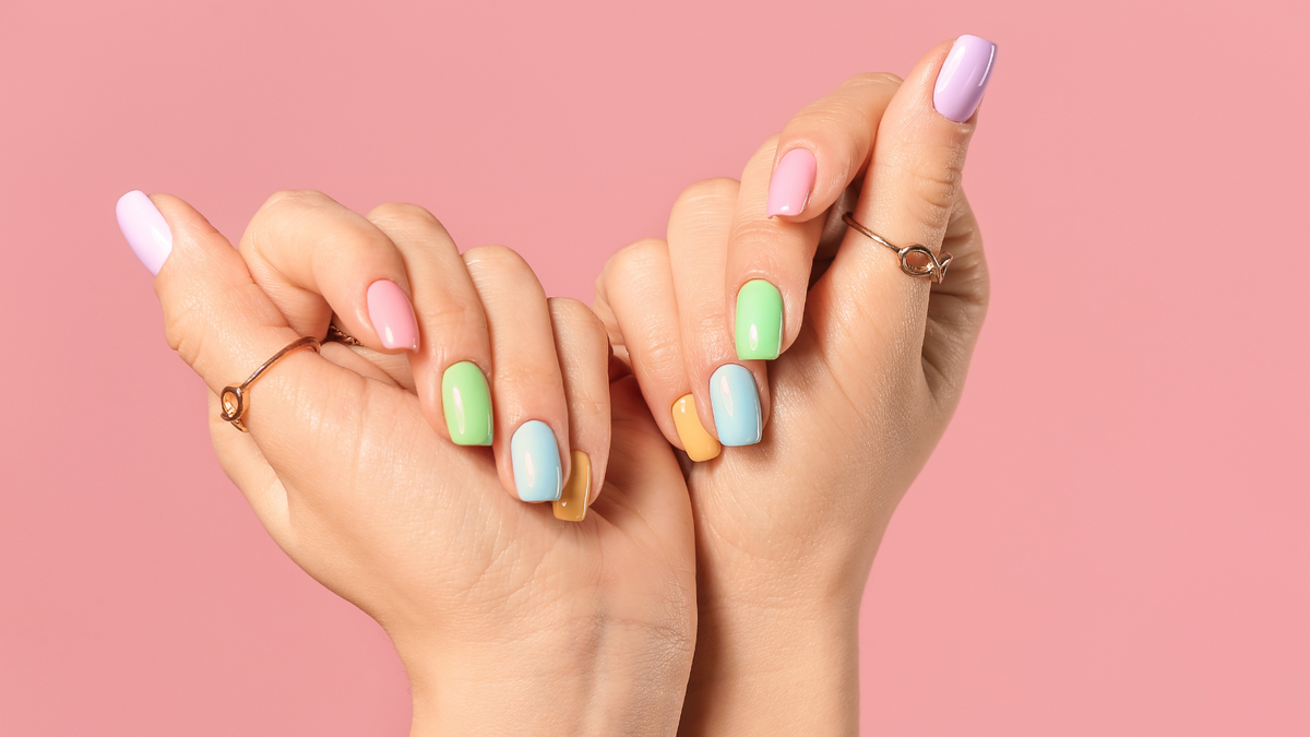 Pasteļu krāsas, kā piemēram, rozā, piparmētru zaļa, gaiši lillā, dzeltena un debeszila, ir ideālas vasarai. Šīs krāsas ir viegli kombinēt ar gaišu apģērbu. Pasteļtoņiem piemīt maigs, sievišķīgs izskats, kas ir vieglāk uztverams, nekā košas krāsas nagu dizainā. Attēlā redzamais nagu dizans izveidots ar ombrē tehniku, kur krāsas maigi pāriet viena otrā. Katrs nags ir krāsots nedaudz atšķirīgā tonī, sākot no gaiši zilas līdz pastel dzeltenai.